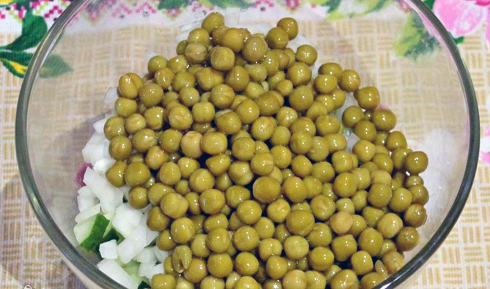 - Verser les pois verts sans liquide, verser la mayonnaise, mélanger, mettre dans un saladier.