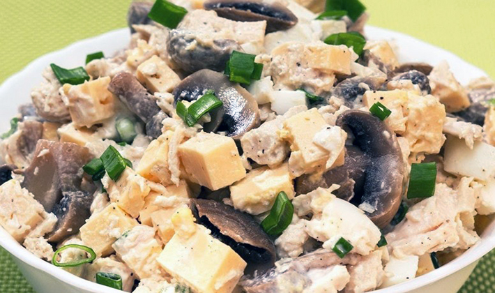 Salades à la poitrine de poulet et aux champignons: recettes