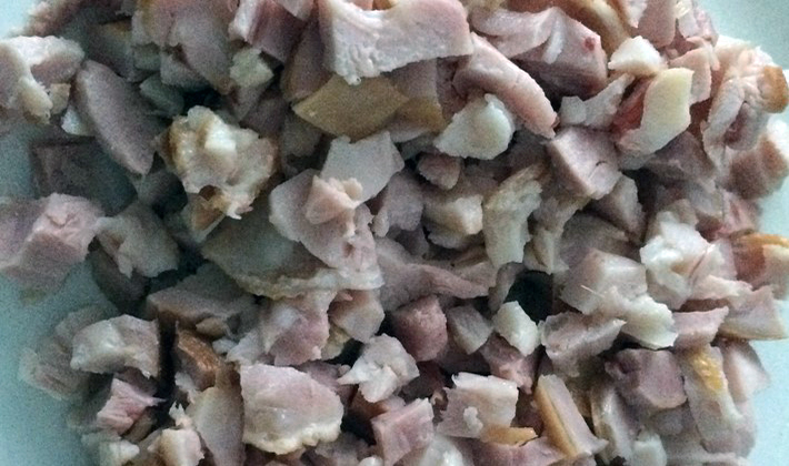 - Viande de poulet fumée et champignons marinés coupés en petits cubes.