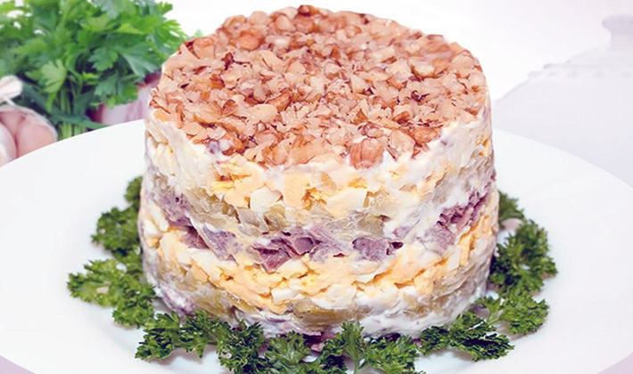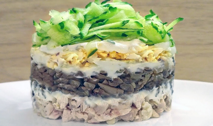 Comme déjà indiqué, préparer une salade avec poitrine et champignons est assez simple, mais les invités seront ravis de son goût.