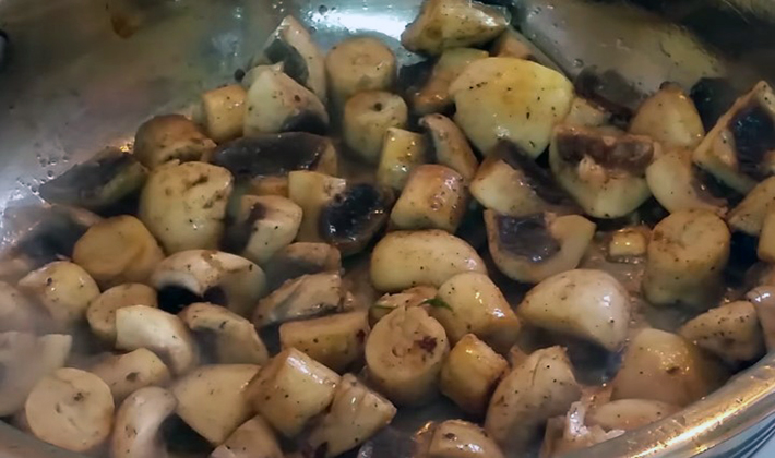 - Peler les champignons, les couper en tranches et les faire revenir dans une casserole dans le beurre jusqu'à ce qu'ils soient dorés.