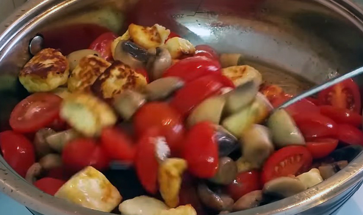 - Peler les œufs et les pommes de terre, les couper en cubes et les combiner avec des champignons.