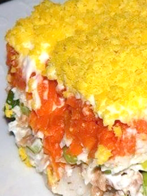 - Verser sur la couche supérieure et graisser avec une sauce à la crème et à la mayonnaise aigre.