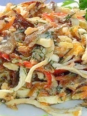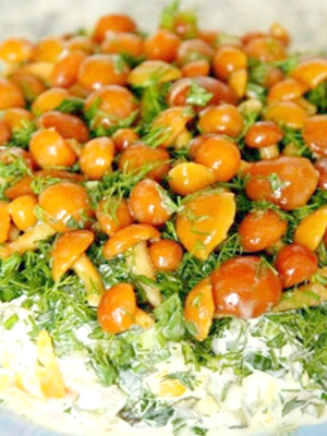 Cuire une salade avec des champignons avec des champignons safran selon la recette avec une photo aidera tous les cuisiniers novices.