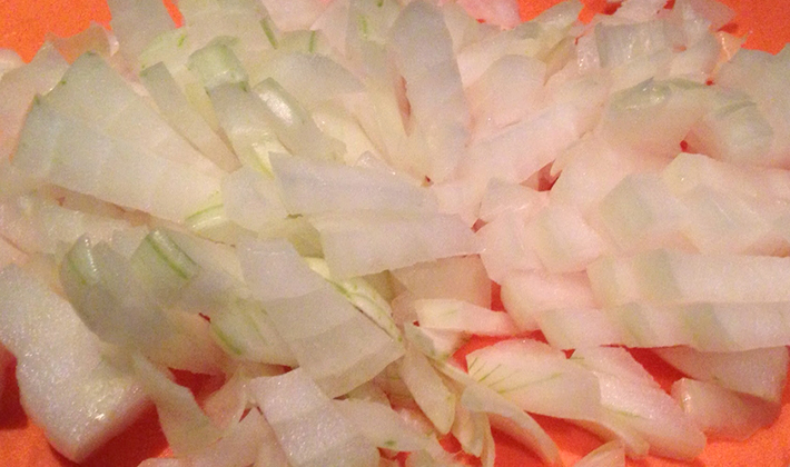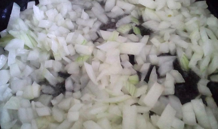 - Épluchez l'oignon, coupez-le en cubes et faites-le revenir jusqu'à ce qu'il soit tendre.