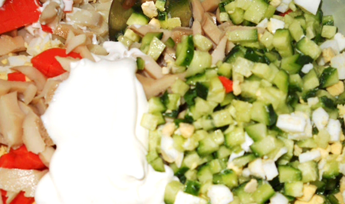 - Couper en lanières concombres, poivrons, mélanger les champignons avec les légumes et bien mélanger.