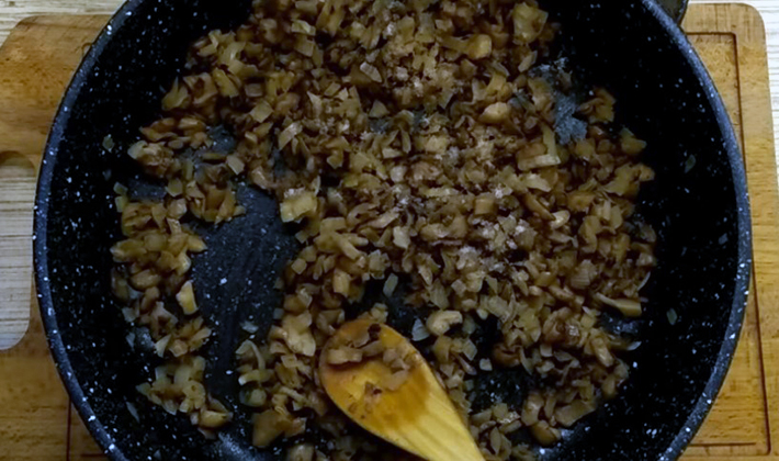 - Peu de temps avant que les oignons soient prêts, ajoutez-y les champignons et faites-les revenir avec les oignons.