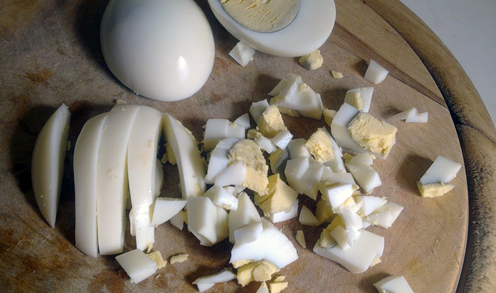 Préparez-le comme suit. Les œufs sont bouillis pendant 15 minutes et mis à l'eau froide. Le concombre est lavé, pelé, coupé en petits cubes. Les œufs refroidis sont également finement hachés. Du maïs est ajouté à ces composants.