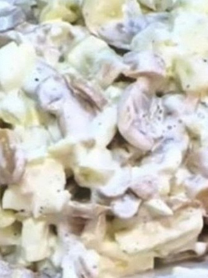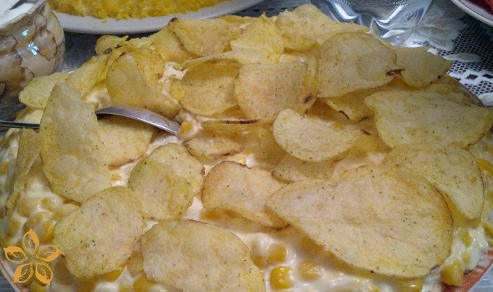 - Quand les champignons et les oignons sont refroidis, les mélanger avec du maïs, assaisonner avec de la mayonnaise, du sel et du poivre.