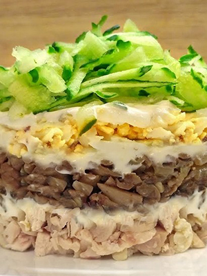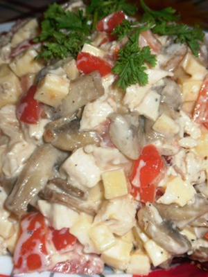 La salade avec poitrine de poulet, champignons et maïs est très savoureuse et satisfaisante et, malgré la présence de composants à haute teneur en calories, elle est bien absorbée.