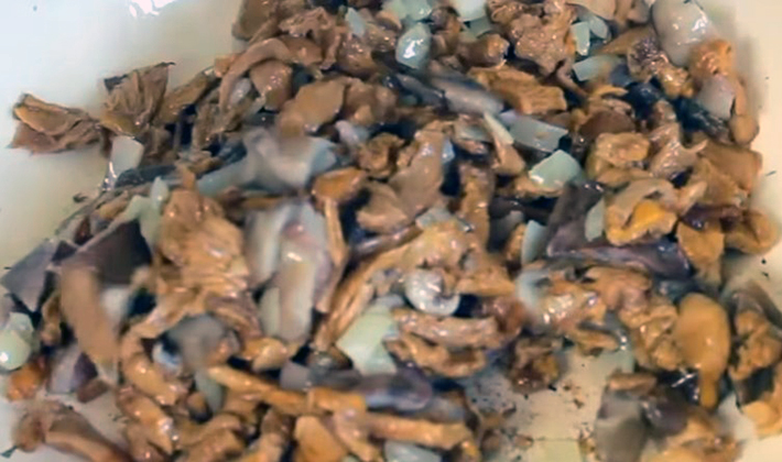 - Couper la viande bouillie en petits morceaux, les organes de fructification après le décapage.