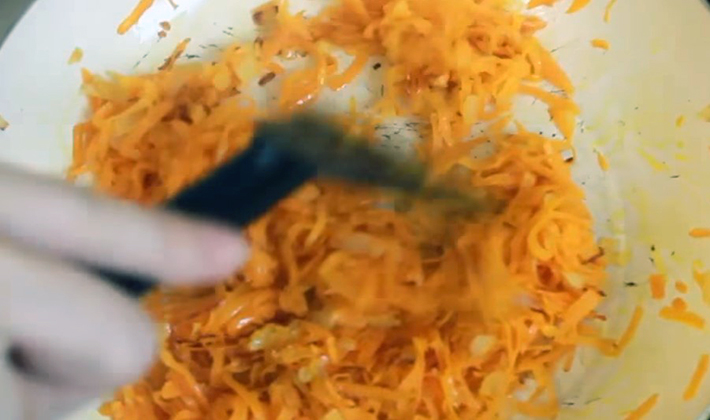Faites frire les carottes épluchées et râpées dans une autre poêle pendant 10 minutes.