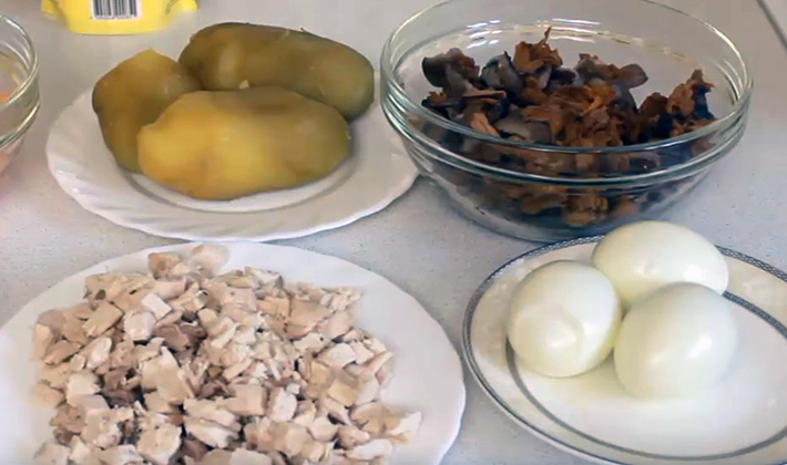 La salade de champignons aux champignons, poulet et fromage est préparée par étapes.