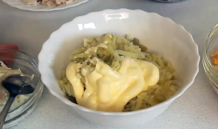 - Verser la mayonnaise, mélanger le tout soigneusement pour mélanger avec tous les ingrédients.