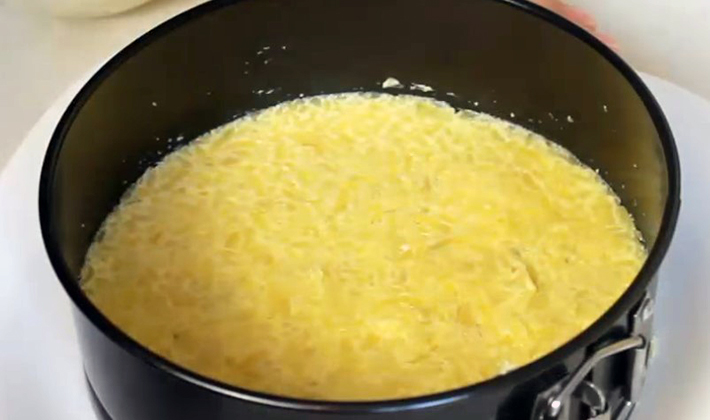 - Mettez les pommes de terre râpées au fond, ajoutez du sel et de la graisse avec de la mayonnaise.