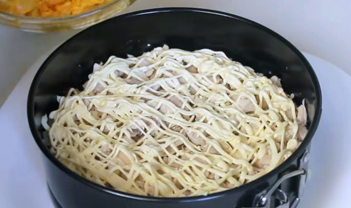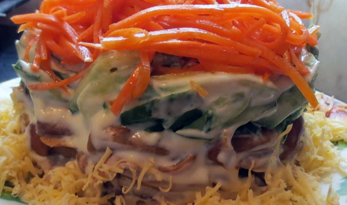 - Recette de salade avec des couches de poulet, champignons et carottes coréennes