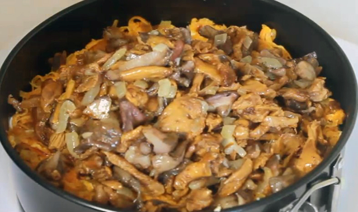 - Couper les champignons en lanières, les faire revenir à l'huile végétale, ajouter au futur plat.