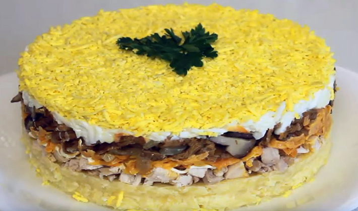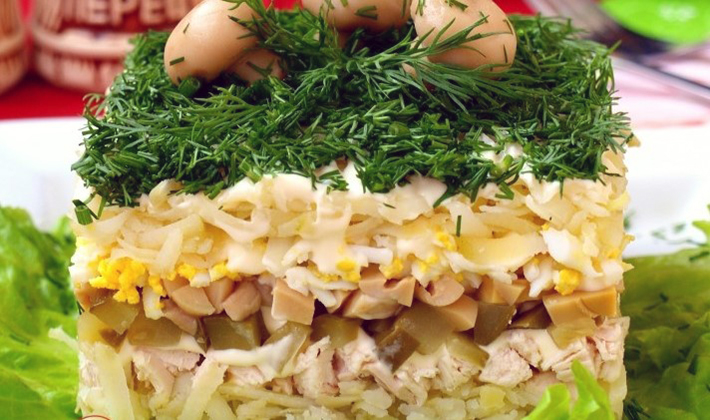 Salade «tsar» au poulet et aux champignons - de la catégorie des recettes populaires à tout moment de l'année. Assurez-vous que cette spécialité deviendra l'une de vos spécialités.