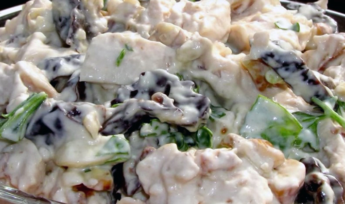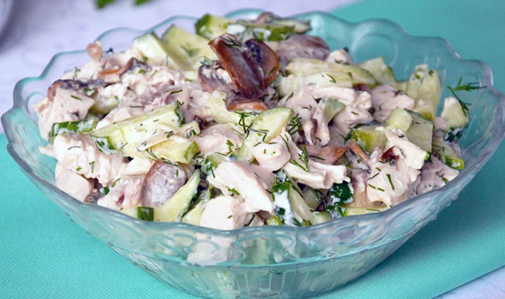 - Salade au poulet fumé, champignons, concombre et pruneaux