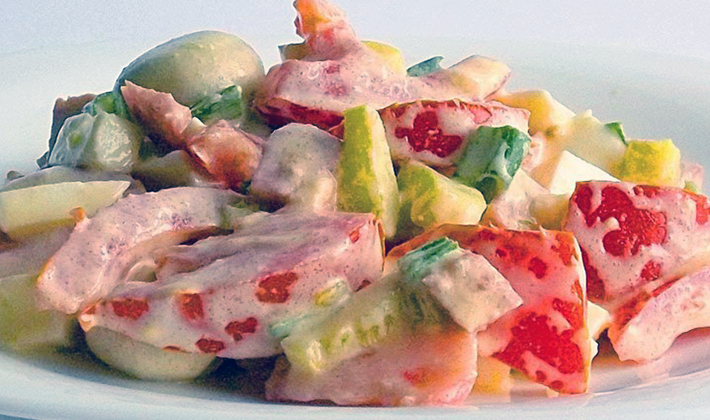 - Mélanger dans un récipient les corbeilles de fruits, le poulet, les concombres, les œufs, le sel, si nécessaire, mélanger.