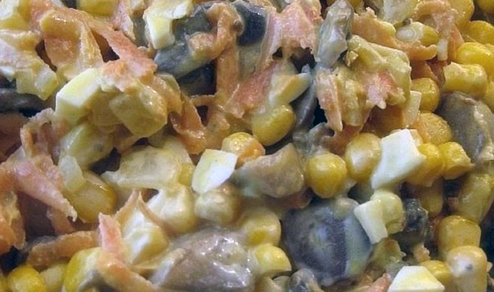 Une salade à base de poulet fumé, de champignons et de fromage peut être préparée tous les jours pour un dîner en famille. Et si vous diluez le plat avec du maïs en conserve, il deviendra encore plus savoureux et la salade pourra être servie à la table de fête.