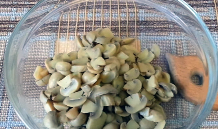 - Couper les champignons en conserve en grosses tranches, laisser les petits chapeaux entiers.