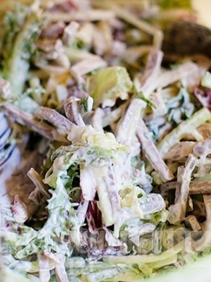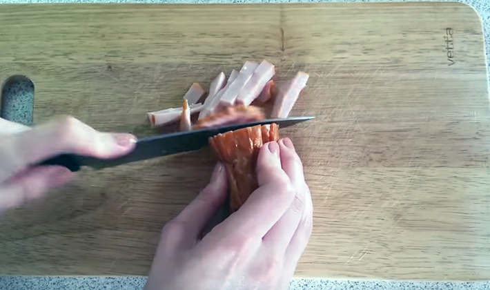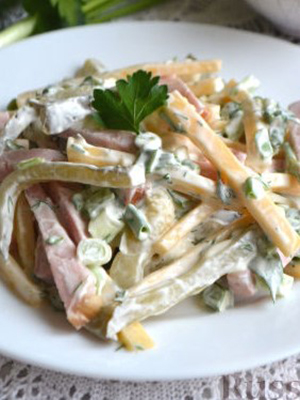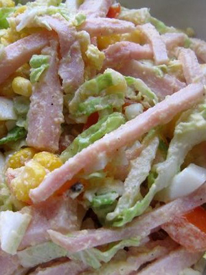 - Feuilles de laitue verte coupées en lanières. Couper le fromage en petits morceaux, jambon - en petites lanières.