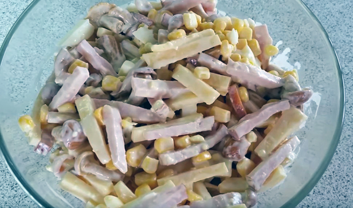La salade au jambon et aux champignons en conserve a un goût inhabituel aigre-doux et une saveur de miel, ce qui la rend attrayante pour les amateurs de plats légers et sans aigreur.
