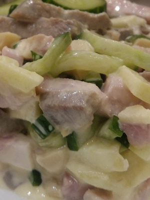 - Salade feuilletée au jambon, champignons, pommes de terre et concombres