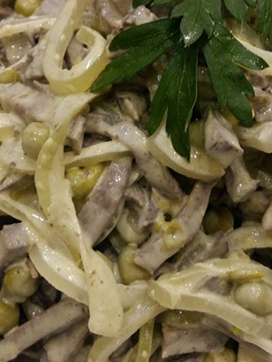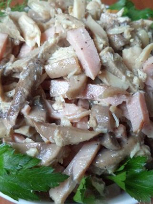 Une salade avec langue, jambon et champignons est très facile à préparer, mais la combinaison de ses composants donne un goût incroyable.