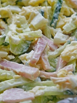 - La couche suivante est le jambon, puis les champignons, couvrez chaque couche avec un filet de mayonnaise. Ensuite, étalez le jaune - râpez-le directement dans le moule, cela rendra la salade plus magnifique et plus appétissante. Étendez-y des lanières de concombre, couvrez-les également de mayonnaise.