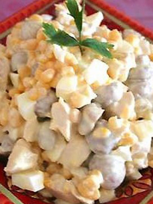 - Les maîtresses doivent noter que dans presque toutes les salades au poulet et aux champignons, le poulet peut être remplacé par du jambon pour ne pas perdre son goût, son goût et sa nutrition.