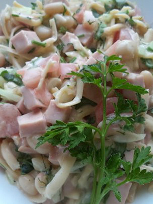 La salade avec haricots, champignons et jambon est préparée comme suit: hachez finement les champignons, coupez le jambon en cubes. Couper et faire revenir l'oignon, y ajouter les haricots, les champignons et le jambon, cuire jusqu'à ce que le liquide disparaisse. Cool, assaisonner avec de la mayonnaise.
