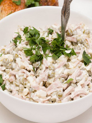 - Mélanger tous les produits avec les pois verts, assaisonner avec la mayonnaise et les mettre dans un saladier. Décorer de carottes.
