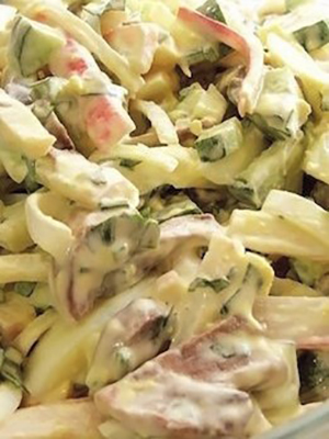 - Couper les pommes de terre, les carottes, les concombres, le jambon, les pommes et le céleri en petits cubes, faire bouillir les champignons et les hacher finement.