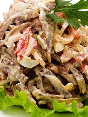 Pour des occasions spéciales, il existe des recettes spéciales pour de telles salades, dont les plus délicieuses sont décrites ci-dessous.