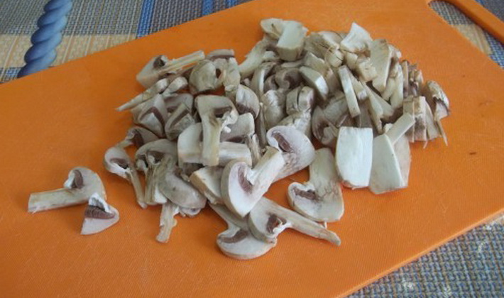 - Épluchez les champignons, lavez-les, séchez-les avec une serviette et coupez-les en petites tranches.