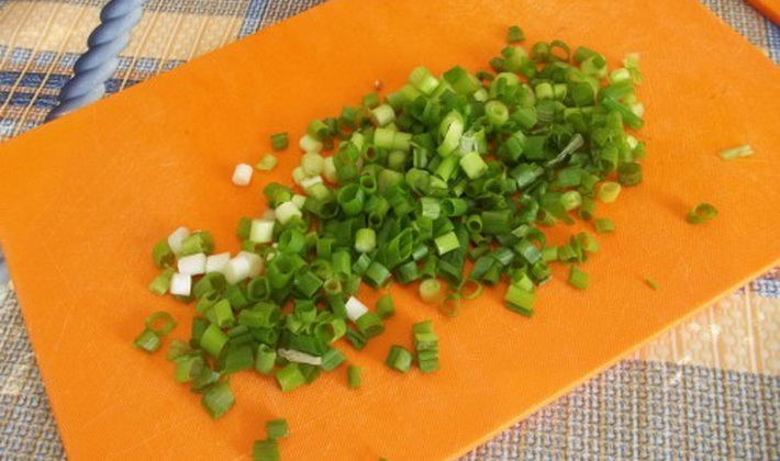 - Lavez les oignons verts, éliminez l'eau restante et hachez-les finement avec un couteau.
