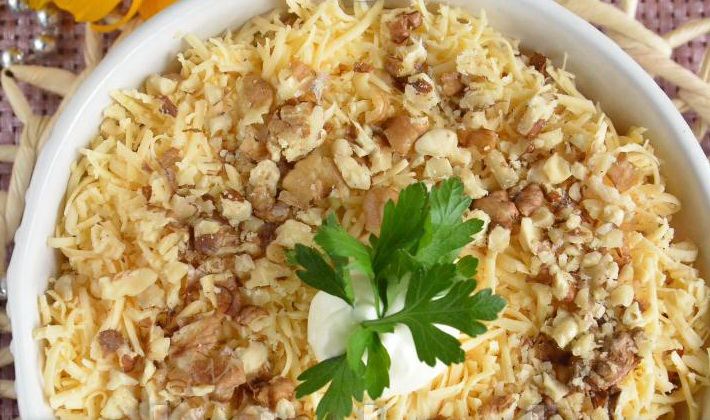 - Réfrigérer pendant une demi-heure pour laisser la salade brasser. Ensuite, étalez dans des saladiers en portions, saupoudrez de verdure et servez.