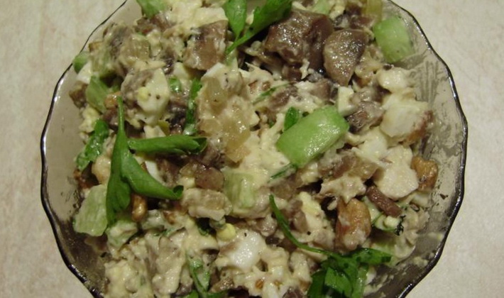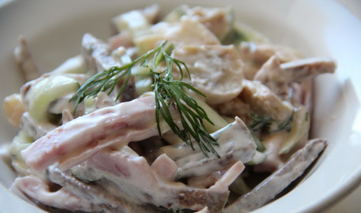 Préparez une salade avec les champignons crus et la langue selon cette recette comme suit: