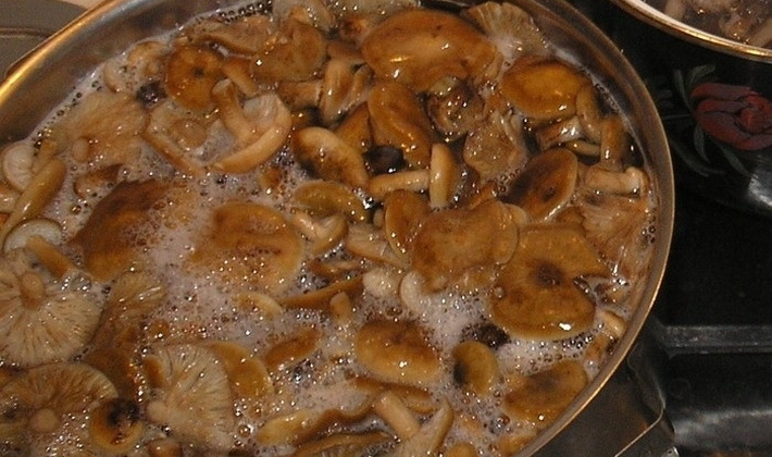 Les champignons de miel sont bouillis pendant 20 minutes dans de l'eau salée, jetés dans une passoire et frits dans de l'huile jusqu'à coloration dorée.
