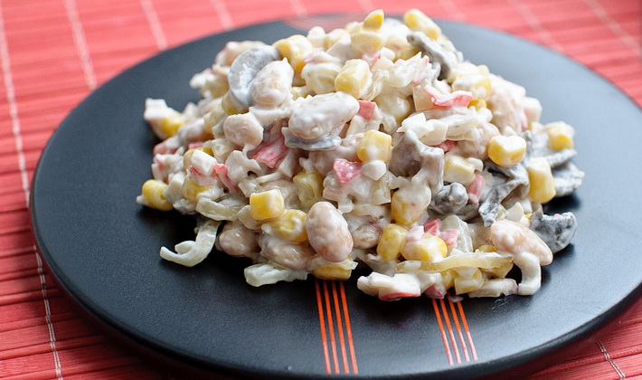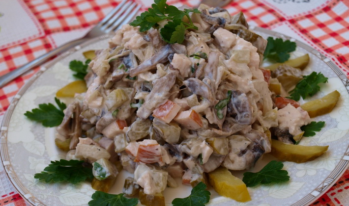 L'une des plus délicieuses salades aux champignons au miel est une salade avec des cornichons et des bâtonnets de crabe.
