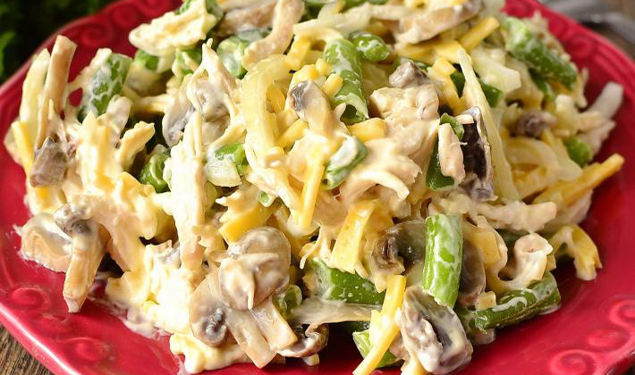 La composition de cette salade comprend des champignons au miel frits avec une poitrine de poulet et des légumes. Tous les ingrédients, une fois combinés, acquièrent une satiété et un jus juteux prononcés.