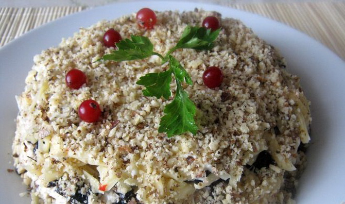 Lubrifiez avec de la mayonnaise, saupoudrez de noix concassées et mettez la salade feuilletée aux champignons de champignons sautés au réfrigérateur pendant 2 heures.
