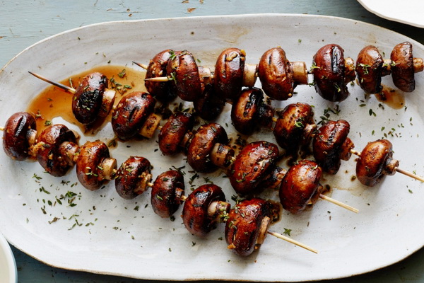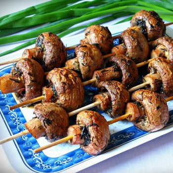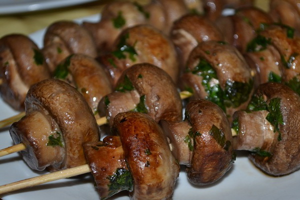 5. Enfiler des champignons marinés sur des brochettes, mettez dans un plat allant au four tapissé de parchemin. Cuire au four pendant 15-20 minutes à une température de 200 degrés.