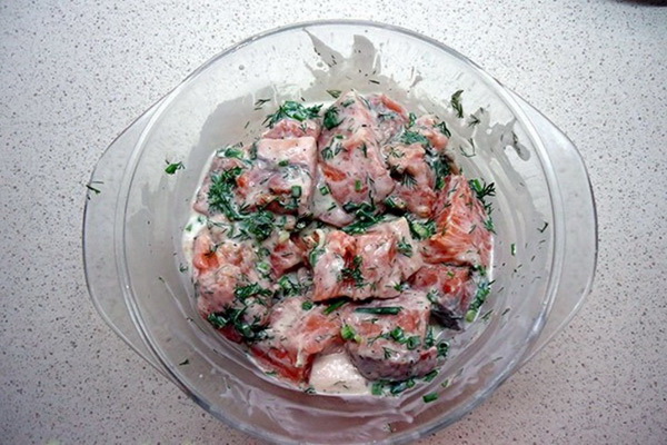 1. Couper le saumon en tranchesfaire mariner dans une crème sure mélangée avec des herbes et des épices.