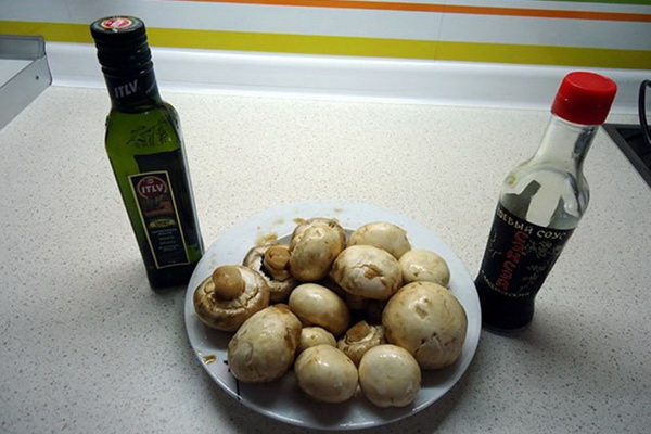 2. bien laver les champignons, sécher, mariner dans un mélange d'huile végétale et de sauce soja. Le saumon et les champignons doivent être vieillis dans la marinade pendant au moins 15 minutes.