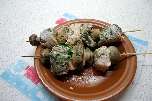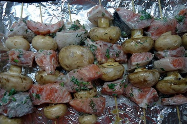 3. Il faut enfiler des champignons et du poisson en brochettes, chaque canapé envelopper dans une feuille.