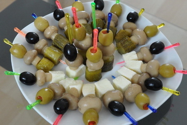 - Canapés de champignon marinés avec du concombre sur des brochettes (avec photo)