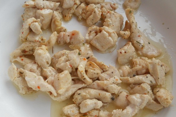 1. Filet de poulet coupé en petits morceaux, faites légèrement frire dans une poêle dans l’huile végétale jusqu’à coloration dorée. Ajoutez du sel, du poivre et toute autre épice à votre goût.